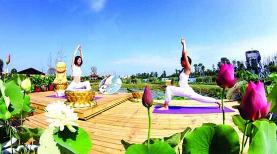 市民在遂寧市城區圣蓮島荷博園練瑜珈
