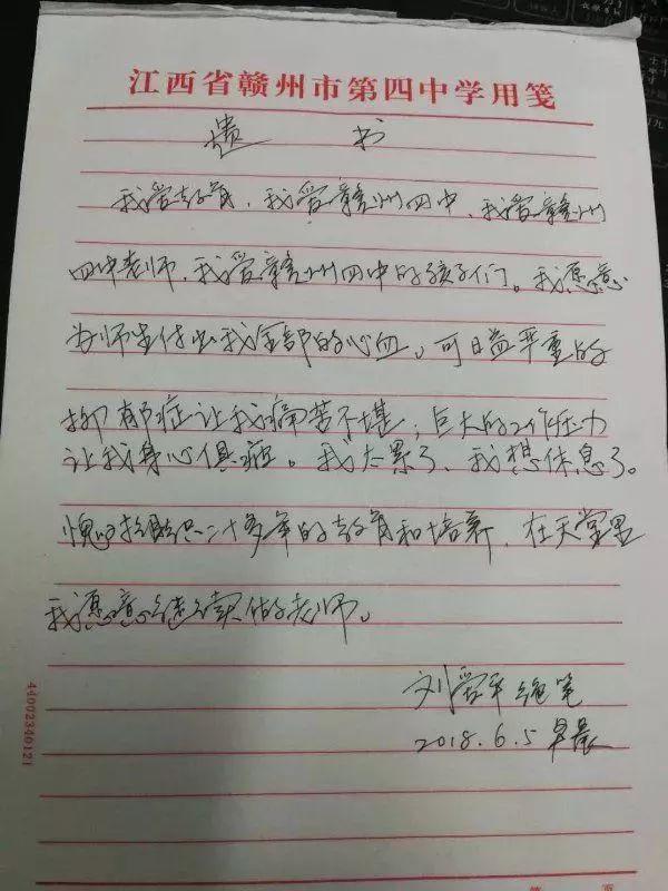這份“遺書”這樣寫道:我愛社會,我愛贛州四中,我愛贛州四中的老師,我愛贛州四中的孩子們,我愿意為全體師生付出全部心血,可日益加重的抑郁癥讓我痛苦不堪,巨大的工作壓力讓我身心俱疲,我太累了,我想休息了…...在天堂里我愿意繼續(xù)做老師。