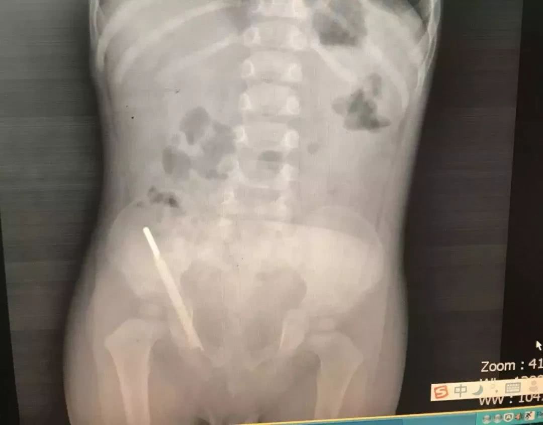 醫生為小強打了開塞露、做了灌腸,但是體溫計沒有排出來。經過兩天的定期拍片門診隨訪,醫生發現體溫計的位置有變化且越來越危險。