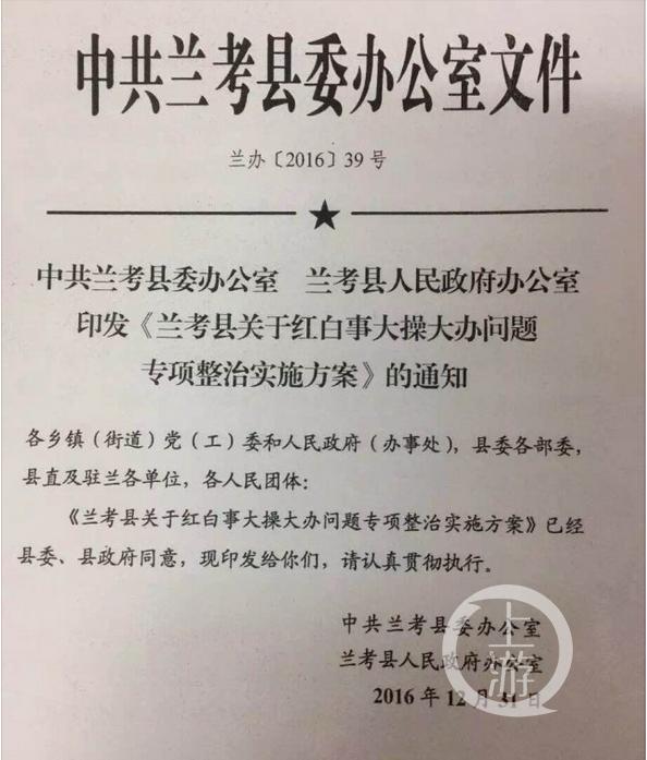 圖說:蘭考縣委縣政府印發(fā)的《蘭考縣關(guān)于紅白喜事大操大辦問題專項整治實施方案》。