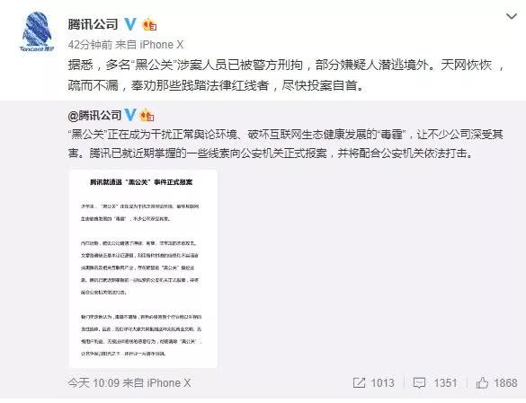 同日午后,騰訊公司再發微博稱,多名“黑公關”涉案人員已被警方刑拘,部分嫌疑人潛逃境外。奉勸踐踏法律紅線者盡快投案自首。