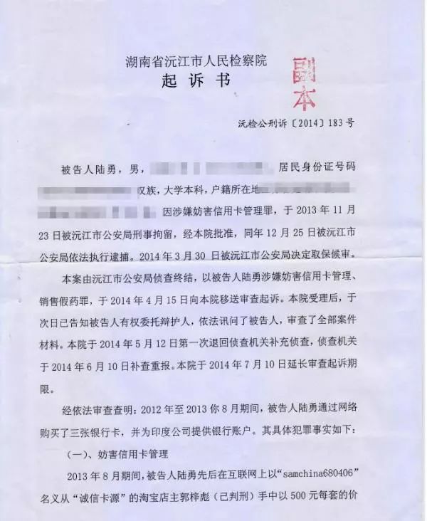 2013年8月,陸勇在互聯(lián)網(wǎng)上購(gòu)買(mǎi)了3張用他人身份信息開(kāi)設(shè)的銀行借記卡,使用了其中1張借記卡用來(lái)吸收銷(xiāo)售假藥的資金。
