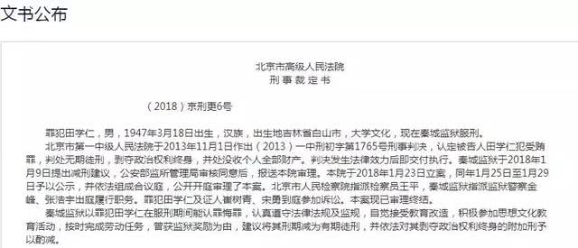 最終,該院于6月29日作出裁定,將田學仁無期徒刑的刑罰,減為有期徒刑22年(自2018年6月29日起至2040年6月28日止),剝奪政治權利改為十年。