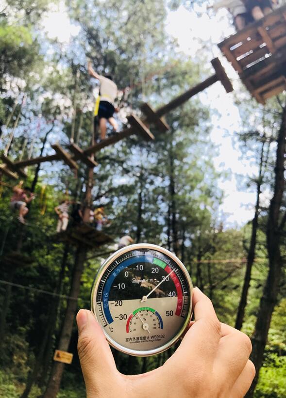 下午一點(diǎn)鐘,通往叢林飛躍的路上,小編便已感受到山風(fēng),不是清風(fēng)徐徐,而是刮得猛烈。奧陶紀(jì)叢林飛躍建在兩山的山谷中,強(qiáng)烈的空氣對(duì)流足以帶走所有的汗水。溫度計(jì)在這里指針停留在了29度,但是根據(jù)小編的親身體驗(yàn),這個(gè)溫度配合強(qiáng)勁的山風(fēng),整體感覺稍微有一點(diǎn)涼,來這里避暑的游客最好穿長褲前來,這樣也可以 避免排隊(duì)等候項(xiàng)目時(shí)被曬得慌。