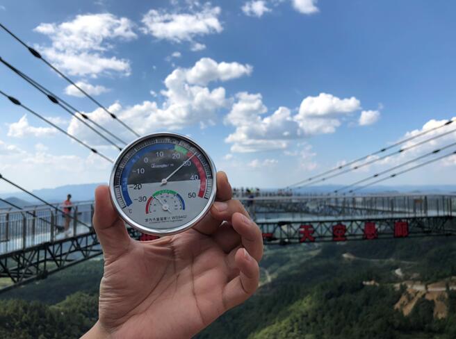 作為奧陶紀(jì)這一網(wǎng)紅景區(qū)的入口處,集結(jié)了天空懸廊、18米懸崖秋千、步步驚心等爆款網(wǎng)紅項(xiàng)目。這一區(qū)域由于極少有綠蔭遮蔽,本以為溫度會(huì)較高。但是,當(dāng)下午兩點(diǎn)鐘,記者來到景區(qū)標(biāo)志性項(xiàng)目天空懸廊時(shí),拿出溫度計(jì),指針定格在了29攝氏度。