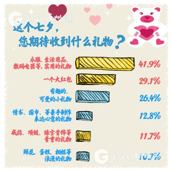據京東大數據研究院七夕“情感消費”調研發現,實用的禮物、大紅包是今年最受期待的禮物。近42%的人想要衣服、生活用品、數碼電器等實用的禮物,超過29%的人想要“一個大紅包”,26%的人認為能收到“有趣的、可愛的小禮物”就滿足了。