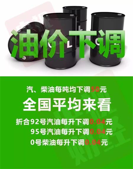 調價周期內,供應充足、美元走強、全球原油需求預期放緩等因素共同影響國際油價震蕩下降。受此影響,國內汽油、柴油的零售價格隨之下調。國家發改委發布消息,汽油、柴油每噸均下調50元。