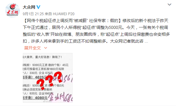 【網傳個稅起征點上調反而“被減薪”社保專家:假的】修改后的新個稅法于昨天下午正式通過,居民個人所得稅“起征點”調整為5000元。今天,一張有關個稅調整后的“收入表”開始在微博、朋友圈瘋傳,稱“起征點”上調后社保繳費也會變相多扣,許多人將來拿到手的工資還不如調整前多。大眾網記者就此咨詢了濟南從事社保方面工作的專家,專家稱,網傳圖片中的計算方法是錯誤的,社保一直按照工資總額這個繳費基數扣除,不存在也不會變相多扣。