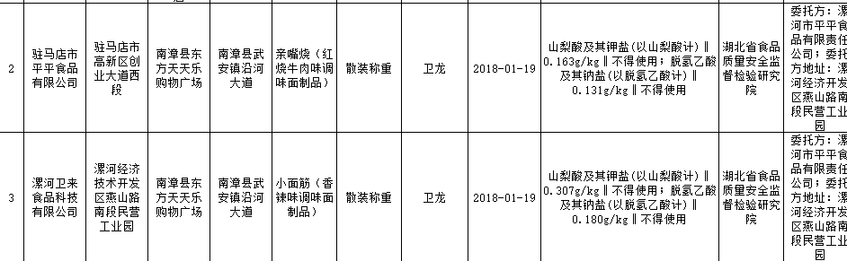 漯河市平平食品有限責任公司委托漯河衛來食品科技有限公司生產的小面筋(香辣味調味面制品)(生產日期/批號:2018-01-19),山梨酸及其鉀鹽(以山梨酸計)檢出值為0.307g/kg,標準要求為不得使用;脫氫乙酸及其鈉鹽(以脫氫乙酸計)檢出值為0.180g/kg,標準要求為不得使用。檢驗機構為湖北省食品質量安全監督檢驗研究院。