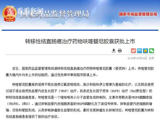 “呋喹替尼”由和記黃埔醫藥(上海)有限公司研發,是首個獨立由中國人發明、中國醫生研究、中國企業研發的抗癌藥。此次獲批上市,意味著它有望成為中國首個上市的1.1類新藥(指未在海外上市的、合成、半合成類藥物)。該藥也是由中國本土企業自主研制的、具有完全知識產權的新型靶向抗癌藥,可為接受過至少兩次化療方案,但仍發生疾病進展的轉移性結直腸癌患者帶來希望,在臨床研究中被證實可顯著延長患者的生存期。