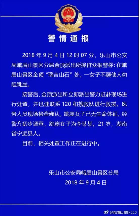 峨眉山景區公安分局官方微博9月4日晚發布警情通報,稱9月4日12時07分樂山市公安分局峨眉山景區分局金頂派出所接群眾報警稱:在峨眉山景區金頂“瑞吉山石”處,一女子不顧他人勸阻跳崖。