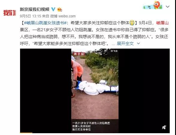 9月5日,據@新京報我們視頻,發布了對該女子的搜救視頻。其中提到“女孩在遺書中稱自己得了抑郁癥。‘很多人把這種病當成脆弱,想不開。我想說不是的,我從來不是個脆弱的人’。女孩還呼吁,‘希望大家能多多關注抑郁癥這個群體吧’”。