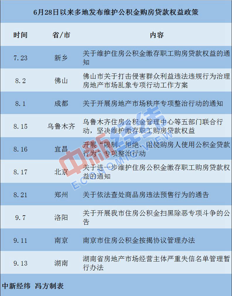 據(jù)中新經(jīng)緯客戶端(微信公眾號:jwview)不完全統(tǒng)計(jì),自6月28日通知公布以來,新鄉(xiāng)、佛山、成都、烏魯木齊、宜昌、北京、鄭州、洛陽、南京等9座城市以及湖南省相繼發(fā)布公積金新政,專門針對通知中整治房企拒絕、變相拒絕公積金貸款購房的違規(guī)行為進(jìn)行整治。