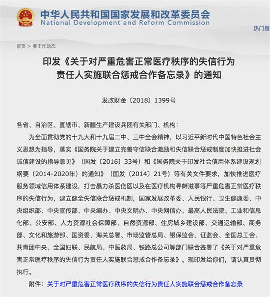 據(jù)國家發(fā)改委官方網(wǎng)站信息,近日,國家發(fā)展改革委、人民銀行、衛(wèi)生健康委、中央組織部、中央宣傳部、中央編辦、中央文明辦、中央網(wǎng)信辦、最高人民法院、工業(yè)和信息化部、公安部、人力資源社會保障部、自然資源部、住房城鄉(xiāng)建設(shè)部、交通運輸部、商務(wù)部、文化和旅游部、國資委、海關(guān)總署、市場監(jiān)管總局、銀保監(jiān)會、證監(jiān)會、全國總工會、共青團中央、全國婦聯(lián)、民航局、中醫(yī)藥局、鐵路總公司等部門聯(lián)合簽署了《關(guān)于對嚴重危害正常醫(yī)療秩序的失信行為責任人實施聯(lián)合懲戒合作備忘錄》。