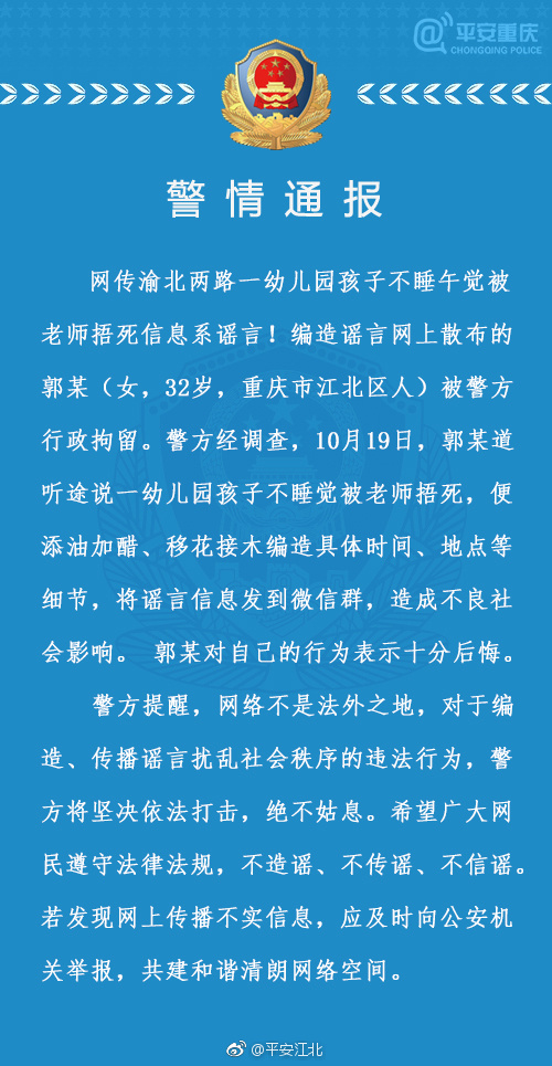 網上不是法外之地,切莫無中生有地造謠傳謠!今(20)日,重慶市公安局江北區分局官方微博@平安江北發布警情通報,網傳渝北兩路一幼兒園孩子不睡午覺被老師捂死信息系謠言!編造謠言網上散布的郭某(女,32歲,重慶市江北區人)被警方行政拘留。