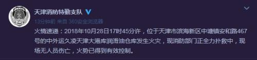 據(jù)天津公安消防總隊特勤支隊官方微博消息,天津公安消防總隊特勤支隊今日發(fā)布火情速遞,2018年10月28日17時45分許,位于天津市濱海新區(qū)中塘鎮(zhèn)安和路467號的中外運(yùn)久凌天津大港庫潤滑油倉庫發(fā)生火災(zāi),現(xiàn)消防部門正全力撲救中,現(xiàn)場無人員傷亡,火勢已得到有效控制。