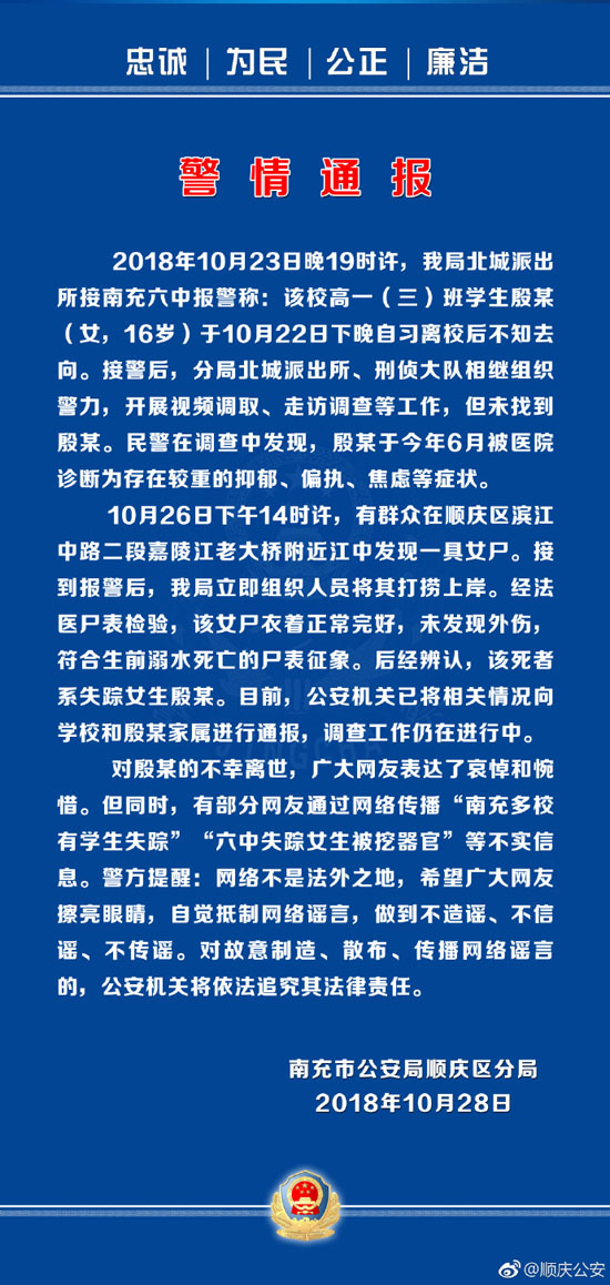 通報稱,2018年10月23日晚19時許,分局北城派出所接南充六中報警稱,該校高一(三)班學生殷某(16歲)于10月22日下晚自習離校后不知去向。接警后,分局北城派出所、刑偵大隊相繼組織警力,開展視頻調取、走訪調查等工作,但未找到殷某。民警在調查中發現,殷某于今年6月被醫院診斷為存在較重的抑郁、偏執、焦慮等癥狀。