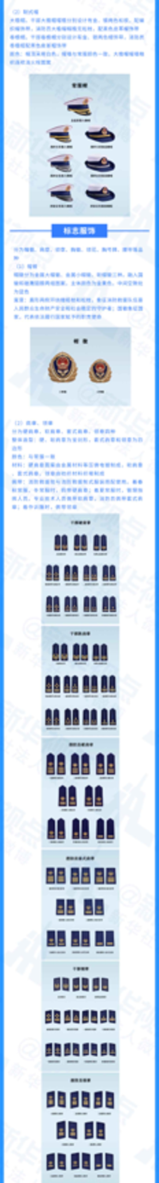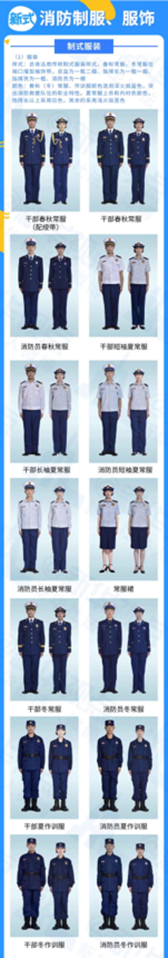 《辦法》明確,消防救援銜標志佩帶在肩章和領章上,肩章分為硬肩章、軟肩章和套式肩章,硬肩章、軟肩章為劍形,套式肩章、領章為四邊形;肩章、領章版面為深火焰藍色。消防救援人員著春秋常服、冬常服和常服大衣時,佩帶硬肩章;著夏常服、棉大衣和作訓大衣時,管理指揮人員、專業技術人員佩帶軟肩章,消防員佩帶套式肩章;著作訓服時,佩帶領章。