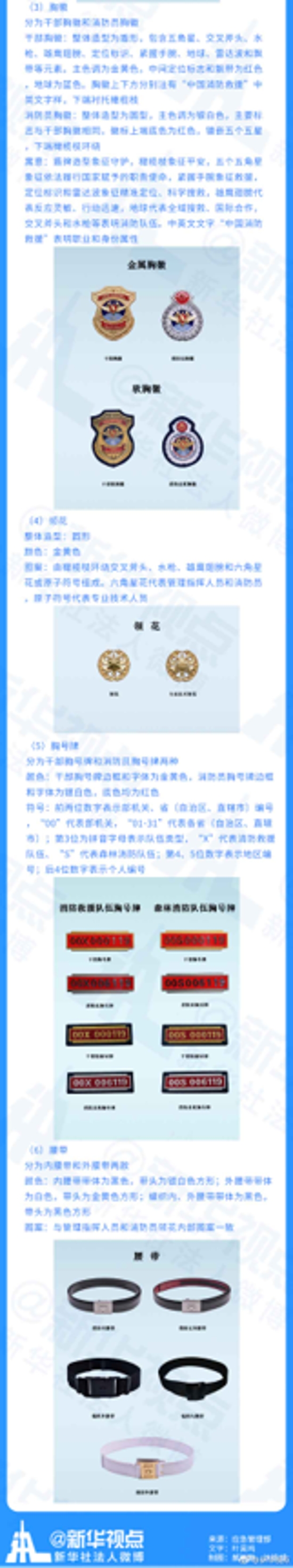 《辦法》規定,消防救援總監、副總監、助理總監銜標志由金黃色橄欖枝環繞金黃色徽標組成,徽標由五角星、雄鷹翅膀、消防斧和消防水帶構成;指揮長、指揮員銜標志由金黃色橫杠和金黃色六角星花組成;高級消防員、中級消防員和初級消防員中的三級消防士、四級消防士銜標志由金黃色橫杠和金黃色徽標組成,徽標由交叉斧頭、水槍、緊握手腕和雄鷹翅膀構成,預備消防士銜標志為金黃色橫杠。