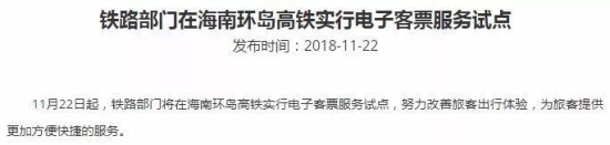 11月22日中國鐵路總公司官網稱,自11月22日起,鐵路部門將在海南環島高鐵實行電子客票服務試點。