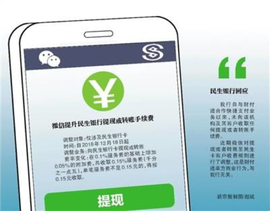 "因民生銀行快捷支付手續費收費較高,基于成本壓力,自2018年12月18日起,向民生銀行卡提現或轉賬到民生銀行卡將在0.1%服務費的基礎上增加0.05%的附加費,共收取0.15%服務費(千分之一點五),單筆服務費不足0.15元的,將按0.15元收取。"微信"零錢"里的這則公告,讓對用戶收費提升的矛頭偏向民生銀行一邊。微信稱,本次調整僅涉及民生銀行卡。