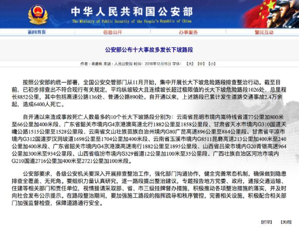 據(jù)中國(guó)之聲《新聞縱橫》報(bào)道:公安部日前(14日)對(duì)外公布了全國(guó)十大事故多發(fā)長(zhǎng)下坡路段,這是公安交管部門從11月開(kāi)始,在集中開(kāi)展長(zhǎng)大下坡危險(xiǎn)路段排查整治行動(dòng)中發(fā)現(xiàn)的。公安部要求,各級(jí)公安機(jī)關(guān)要深入開(kāi)展排查整治工作,在按時(shí)完成排查任務(wù)的同時(shí),對(duì)相關(guān)路段逐一提出整治建議。那么,本次發(fā)布的事故多發(fā)路段有哪些?發(fā)布之后,有關(guān)地方有什么反饋?將會(huì)怎樣整改?