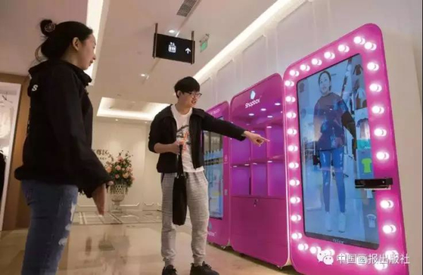 2017年,江蘇南京,顧客正在體驗“虛擬試衣鏡”,不用脫衣也能換裝,高科技進入服裝零售業