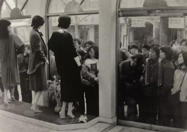 1987年2月20日清晨,在上海北京西路石門路上的蒙麗莎時裝公司櫥窗前,一群顧客正等待公司開門營業。 謝偉民 視覺中國