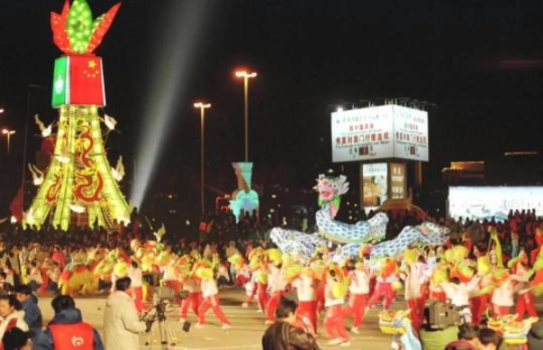 1999年12月20日凌晨,天津市民慶澳門回歸活動達到高潮。新華社記者 馬平 攝