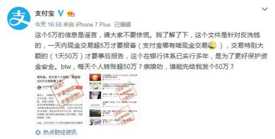 這個5萬的信息是謠言,請大家不要驚慌。我了解了下,這個文件是針對反洗錢的,一天內現金交易超5萬才要報備(支付寶哪有啥現金交易),交易特別大額的(1天50萬)才要事后報告,這個在銀行體系已實行多年,是為了更好保護資金安全。btw,每天個人轉賬超50萬?親娘叻,誰能先給我發個50萬?