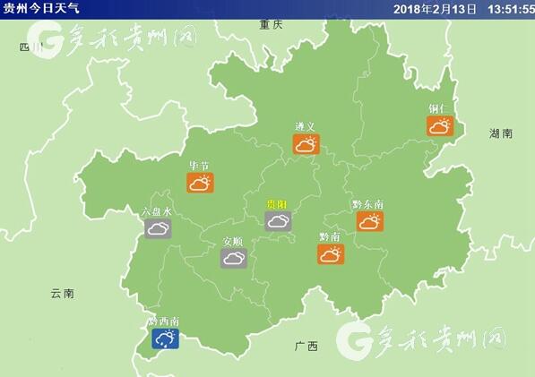 2月15日(除夕):銅仁市、黔東南州、遵義市陰天為主有零星小雨,黔西南州、六盤水市、畢節市中西部晴,其余地區白天多云,夜間有零星小雨。