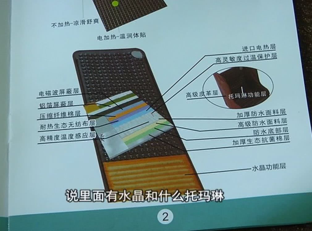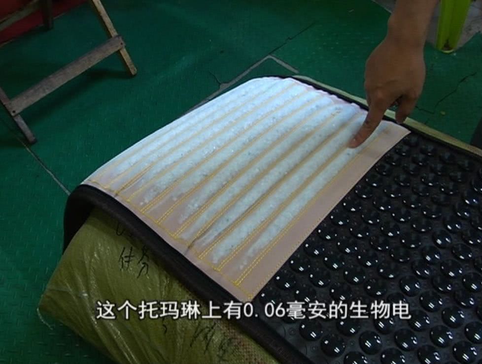 李鑫:這款產品叫多功能毯,這上面有托瑪琳石,這邊還有白水晶,有0.06毫安的電,可以補充生物電,提高免疫力,坐完會感覺腿部放松,白水晶可以補充能量。