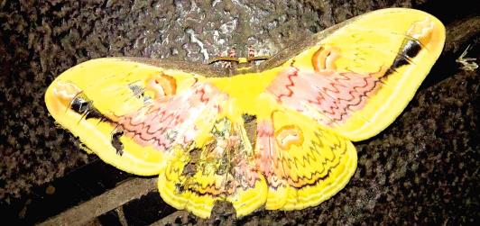 從外觀形態特征看,這只紅大豹天蠶蛾單翅展長約10-14厘米。通體大部為黃色,胸部前緣灰褐色,腹部兩側有黑色斑點。