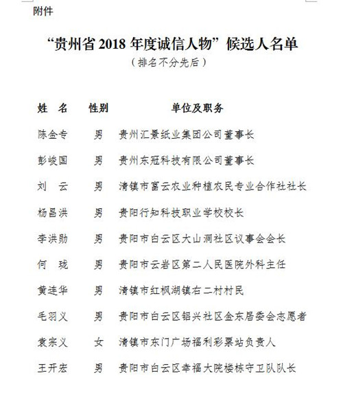 “貴州省2018年度誠(chéng)信人物”候選人名單