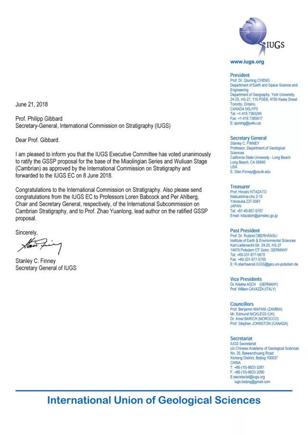 國際地科聯秘書長Stan Finney教授簽發的寒武系苗嶺(第三統)和烏溜階(第五階)“金釘子”批準書