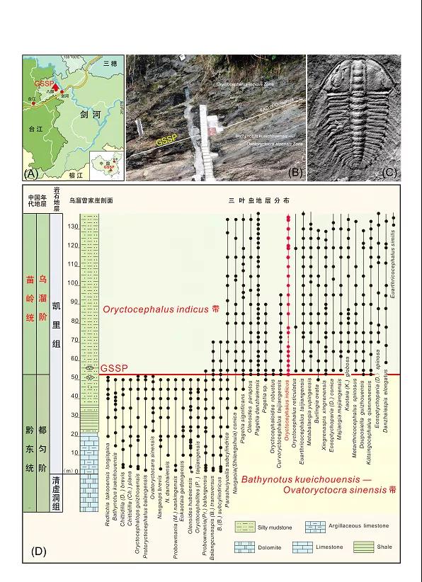 據趙元龍教授介紹,與中國其他“金釘子”不同,劍河“金釘子”不僅含有豐富的、以掘頭蟲類為主的三葉蟲動物群,還在緊接“金釘子”點位之上的凱里組下部的地層中,發現有布爾吉斯頁巖生物群類型的全球烏鎦統凱里生物群。這個特殊保存的生物群,包含10個化石門類,120余個化石屬,具有重要的科學意義。