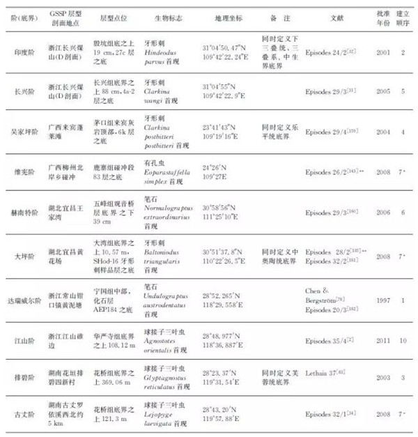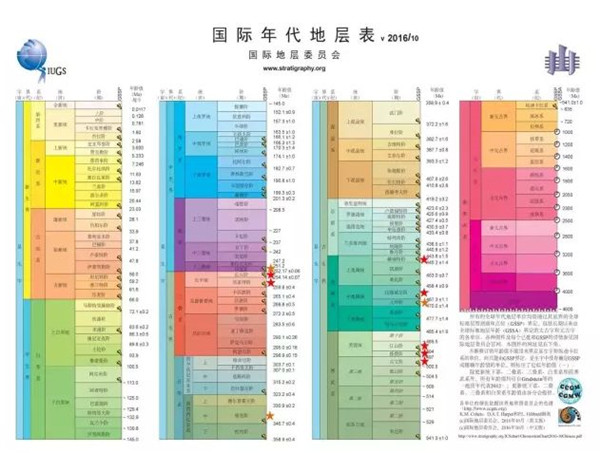 國際年代地層表,截至2017年2月,有星號標志的為中國確立的“金釘子”