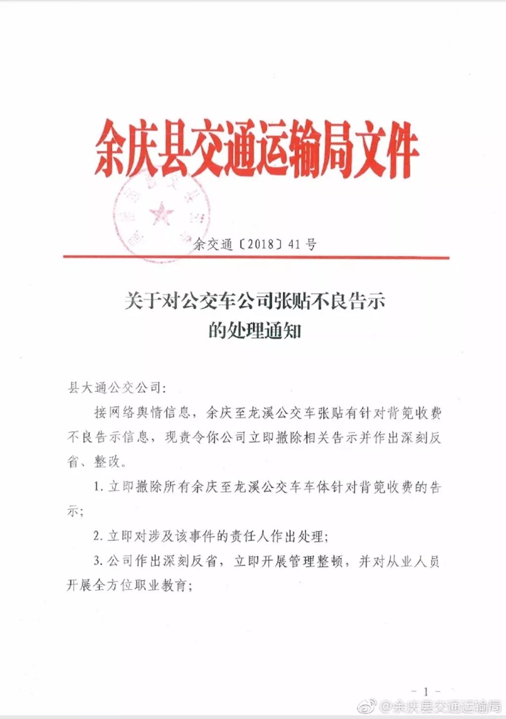 7月6日,多個微信和微博用戶發布了一張圖片,該圖片顯示疑為一張張貼在公交車玻璃窗上的《告示》,《告示》內容為:背背篼的乘客請主動對背篼進行投幣,大背篼2元,小背篼1元。落款為“余慶公交公司(宣)”,時間是2018年7月5日。告示中還配有大小背篼圖片,引來網友圍觀。