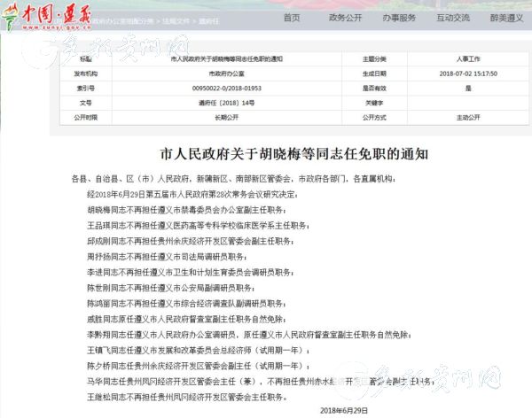 胡曉梅同志不再擔任遵義市禁毒委員會辦公室副主任職務;