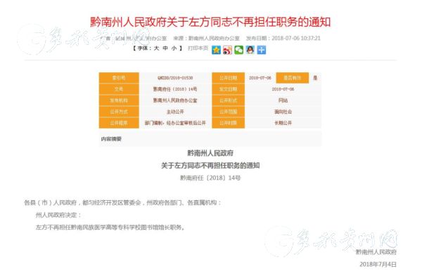 左方不再擔(dān)任黔南民族醫(yī)學(xué)高等專科學(xué)校圖書館館長職務(wù)。