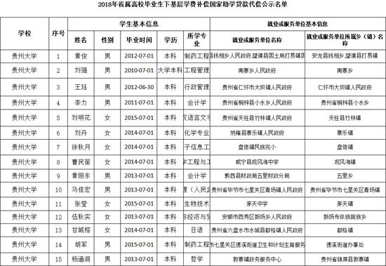 近日,記者從貴州省教育廳網獲悉,2018年省屬高校畢業生下基層學費補償國家助學貸款代償名單正在公示。
