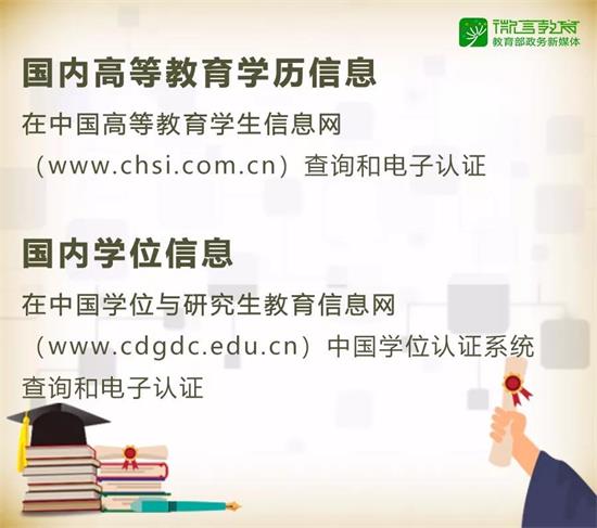 國內高等教育學歷信息在中國高等教育學生信息網(www.chsi.com.cn)查詢和電子認證;
