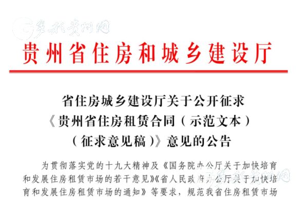 據悉,為規范我省住房租賃市場行為,保護住房租賃合同雙方當事人合法權益,貴州省住房和城鄉建設廳、貴州省工商行政管理局結合我省實際,聯合制定了《貴州省住房租賃合同(示范文本)(征求意見稿)》,擬在全省行政區劃范圍內推廣使用,現正公開向社會各界征求意見,并將根據各界反饋意見進一步修改完善后適時發布。