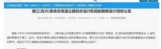 9月5日,貴州省交通運輸廳官網公布了德江(合興)至余慶高速公路初步設計階段的勘察設計已具備招標條件。