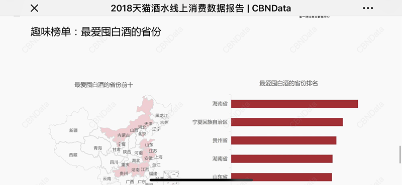 有趣的是,在《2018天貓酒水線上消費(fèi)數(shù)據(jù)報(bào)告》中,對(duì)全國(guó)囤白酒的省份進(jìn)行了分析,數(shù)據(jù)顯示,最愛(ài)囤白酒的省份第一竟是海南省,其次是寧夏,第三則是貴州省。