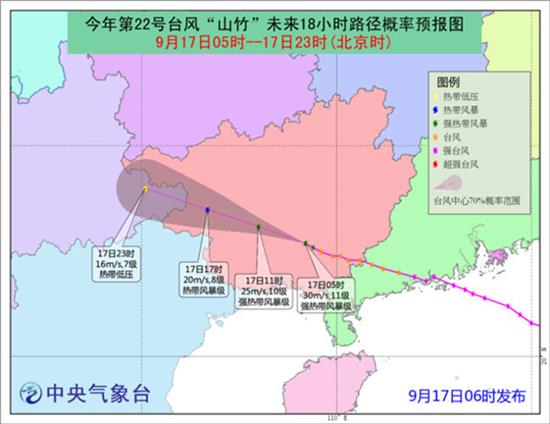 中央氣象臺9月17日6時發布的“山竹”未來18小時路徑概率預報圖顯示,預計“山竹”將一路穿行過廣西,于今日17時左右抵達廣西和云南的交界處,靠近貴州。