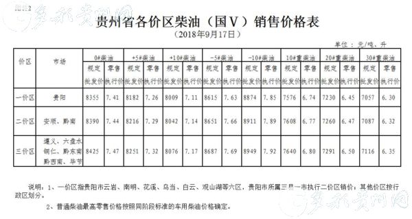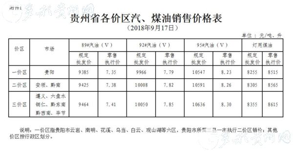 根據國家成品油價格形成機制,國家發展改革委決定自2018年9月17日24時起上調國內成品油價格。按照國家相關調整要求,貴州省89#汽油(國Ⅴ)和0#柴油最高零售價格每噸在現行標準基礎上均提高145元,具體零售價格可由各零售經營企業在不超過最高零售價格的前提下確定。調整后各油品具體最高價格見附件。