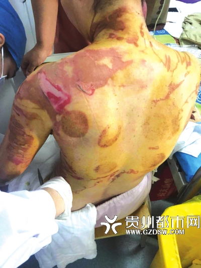 18日中午,受傷的劉女士仍躺在貴鋼燒傷醫院病房里,雖然離受傷當天已經過去10余天,但是,背部及手臂被燙傷的皮膚仍未治愈,衣服稍微貼緊一點,就會導致劉女士不停的喊“疼”。