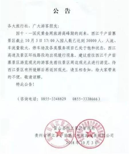 對此,10月3日,雷山縣旅游發(fā)展委員會提醒游客:為了人身安全和游覽質(zhì)量,請合理安排出行時間,提前購票,謹慎前往,景區(qū)游客量逼近承載量時,可改道雷山縣郎德景區(qū)看原生態(tài)歌舞、控拜麻料烏高銀匠村體驗銀飾制作、大塘景區(qū)看水上糧倉、雷山縣城大劇院看蝴蝶媽媽大型舞劇等。