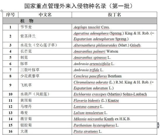 《國家重點(diǎn)管理外來入侵物種名錄(第一批)》